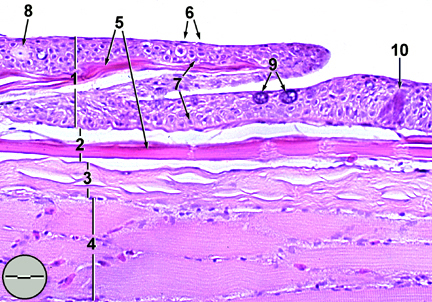 The integumentary system or skin of the fathead minnow is composed of two layers, an outer epidermis and an underlying dermis (Fig. 1). The epidermis is additionally divided into an outer fusiform layer composed of stratified squamous epithelial cells and a basal layer (stratum basale) of undifferentiated germinal cells. In general, thickness of the epidermis is greatest on the dorsal surface and toward the head (10-15 cells) and thins caudoventrally (2-3 cells). The dermis is composed primarily of collagenous connective tissue distinguished as stratum compactum, a dense collagenous matrix providing structural strength and stratum spongiosum, a loose network of collagen and reticulin fibers. Dermis also contains pigment cells called chromatophores. Other cells found within the epidermis include; mucous cells, alarm cells , and taste buds . Mucous cells derive from undifferentiated basal cells as they increase in size and migrate to the surface(Fig. 2). Mucus secretions, composed primarily of glycoproteins, form a slimy protective coat. Functions attributed to this coat include drag reduction (Hoyt, 1975), predator evasion, and isolation of surficial epithelial cells from bacteria. Immunoglobulins, also present in mucus, provide additional protection against infection. Alarm cells, found in greatest densities on the head, release fright substances (Schreckstoff) when ruptured (Fig. 3). Upon detection these substances incite predator avoidance responses in other fatheads and may serve to reduce cannibalism (Moyle and Cech, 1996). Cutaneous taste buds, also found predominantly on the head and ventral surface, are chemoreceptive and assist in locationg food (Fig. 4). Typically taste buds are bulb shaped structures comprised of sensory, basal, sustentacular, and marginal cells. They emanate from the basement membrane often protruding above the epithelial surface. Cutaneous taste buds are innervated by the branches of the facial nerve (cranial nerve VII). Prominence of the facial lobe of the medulla oblongata indicates the reliance fathead minnows place on gustatory sensation (Kapoor, et al., 1975). Fathead minnows are covered with an armor of cycloid scales (except on their heads which, like all Cyprinidae, are scaleless). Cycloid scales are translucent, acellular plates of collagenous tissue which anchor within dermal scale pockets in the stratum spongiosum but project through the basement membrane into the epidermis (Fig. 5). They are covered by a thin squamous epithelium which remains distinct from epidermal tissue. Scales overlap one-another in an imbricated manner with free ends directed caudad. They tend to be of moderate size but are much reduced and irregularly arranged in the predorsal region (between head and dorsal fin)(Jenkins & Burkhead, 1994). Breeding male fathead minnows develop horny nuptial tubercles